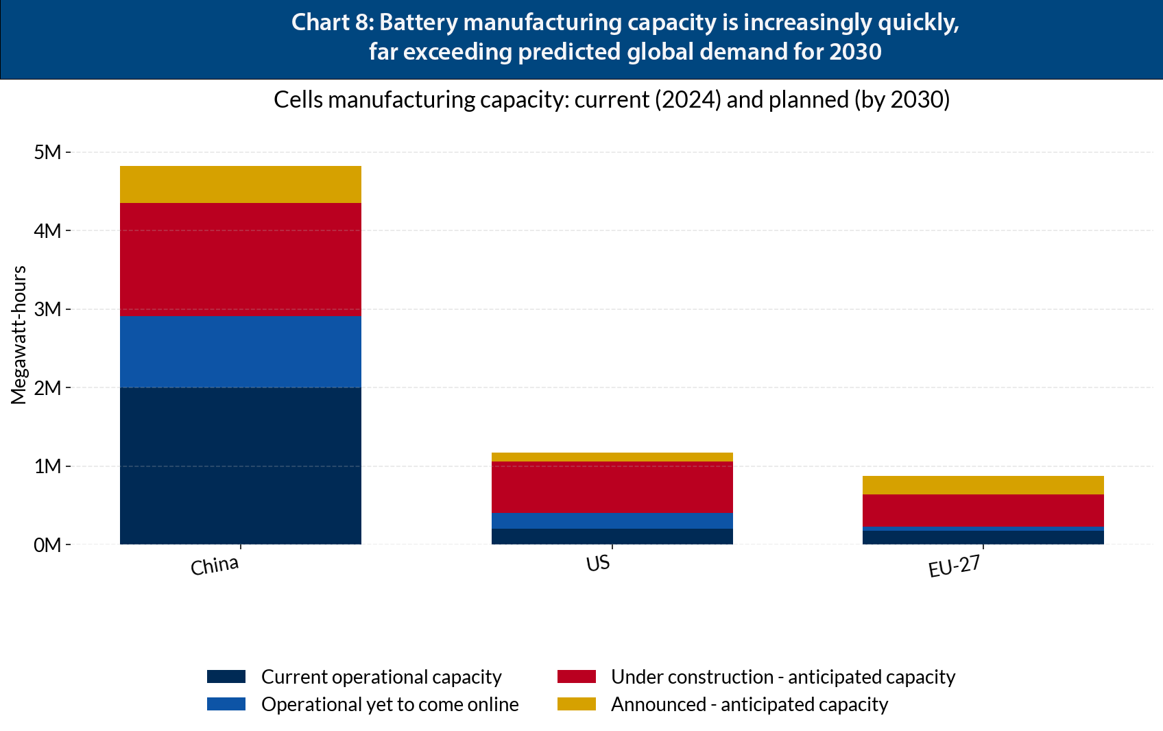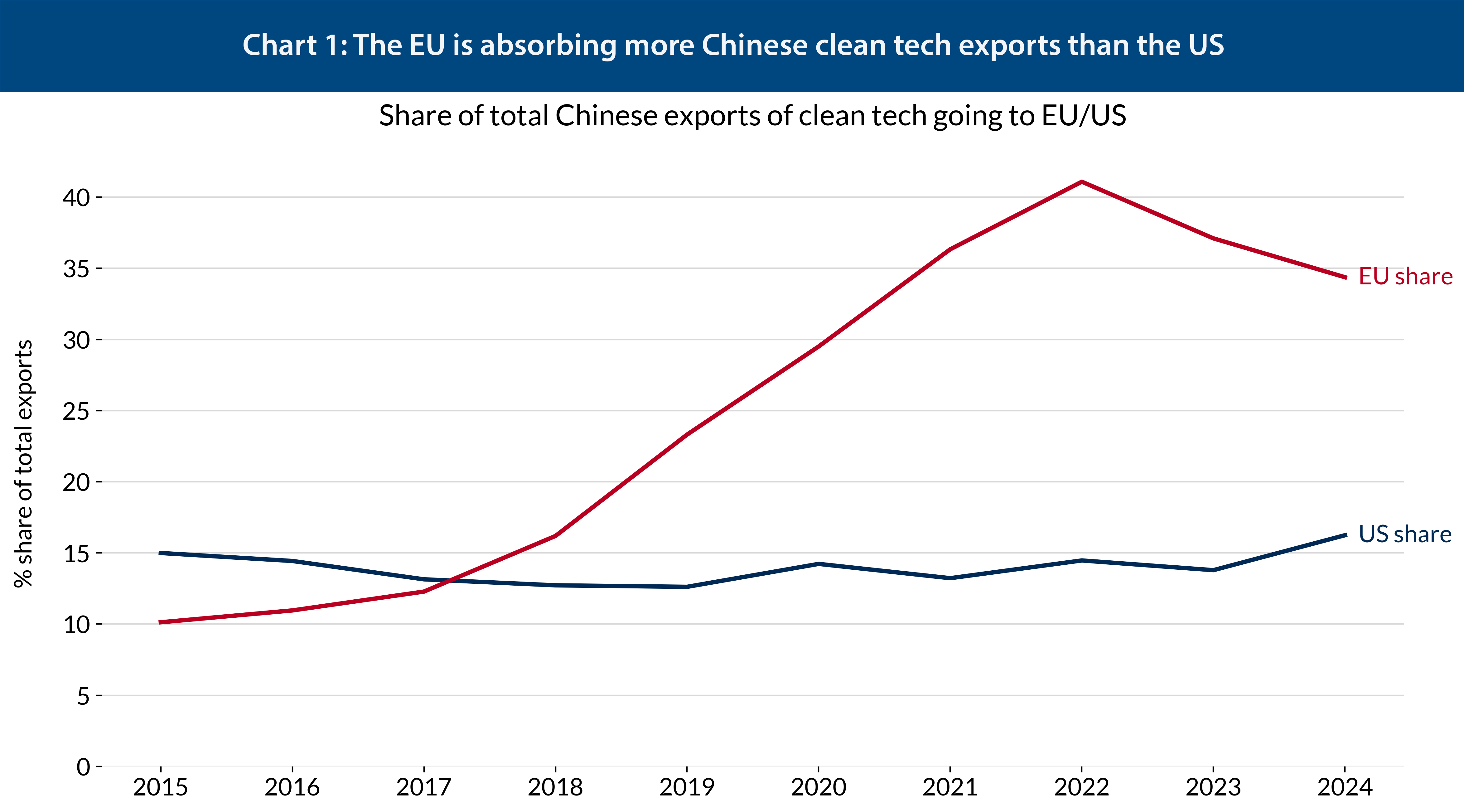 - At the same time, China’s oversupply of many clean tech products – from electric vehicles to solar panels – has increased. This puts EU-based manufacturers under pressure from low-cost, often subsidised competition, and risks deepening Europe’s dependency on Chinese tech. Due to US trade barriers, cheap Chinese exports are being redirected towards Europe, amplifying these pressures.