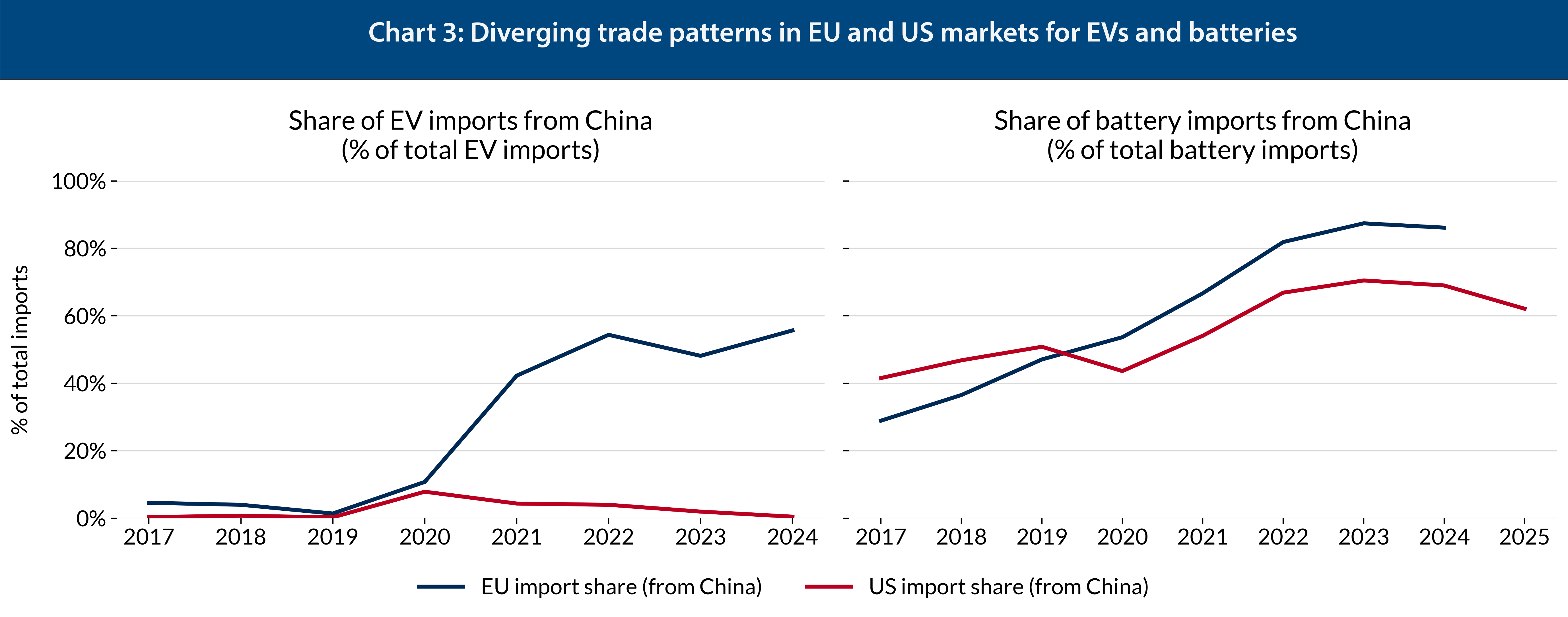 A striking example of trade re-routing in the first US-China trade war was lithium-ion batteries. Batteries are the only clean technology where the US and the EU imported comparable volumes from China ahead of the 2018-2020 trade war. The US did not entirely close its market to Chinese batteries (unlike EVs), but introduced a series of harsher trade restrictions than the EU. As a result, Chinese import concentration in the US declined in 2019-2020 – showing that the US diversified its battery imports in response – while it continued to rise in the EU. Afterwards, import concentration from China picked up again in the US, though at a slower pace than in the EU (Chart 3).