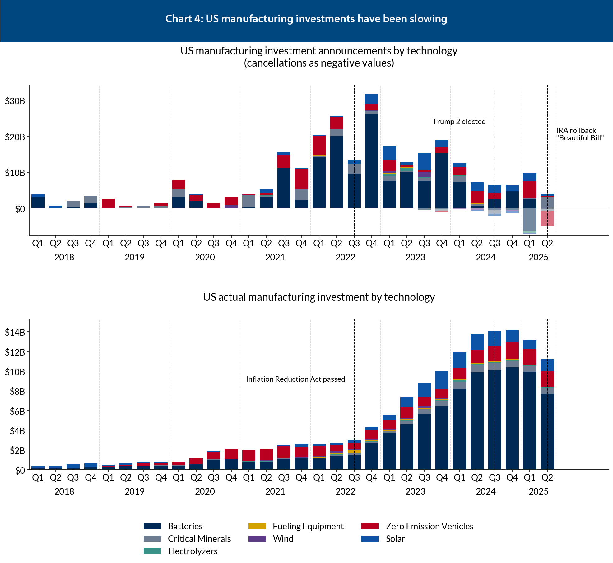 But Trump’s OBBB is now entirely stopping some IRA subsidies and is speeding up the phase-out of others.9 Additionally, the Trump administration is actively erecting investment barriers against some clean technologies, including by attacking individual projects in wind energy. The effect is substantial: for US electricity and clean fuels production alone, the OBBB is estimated to reduce cumulative capital investments by $500 billion in 2025-2035.10