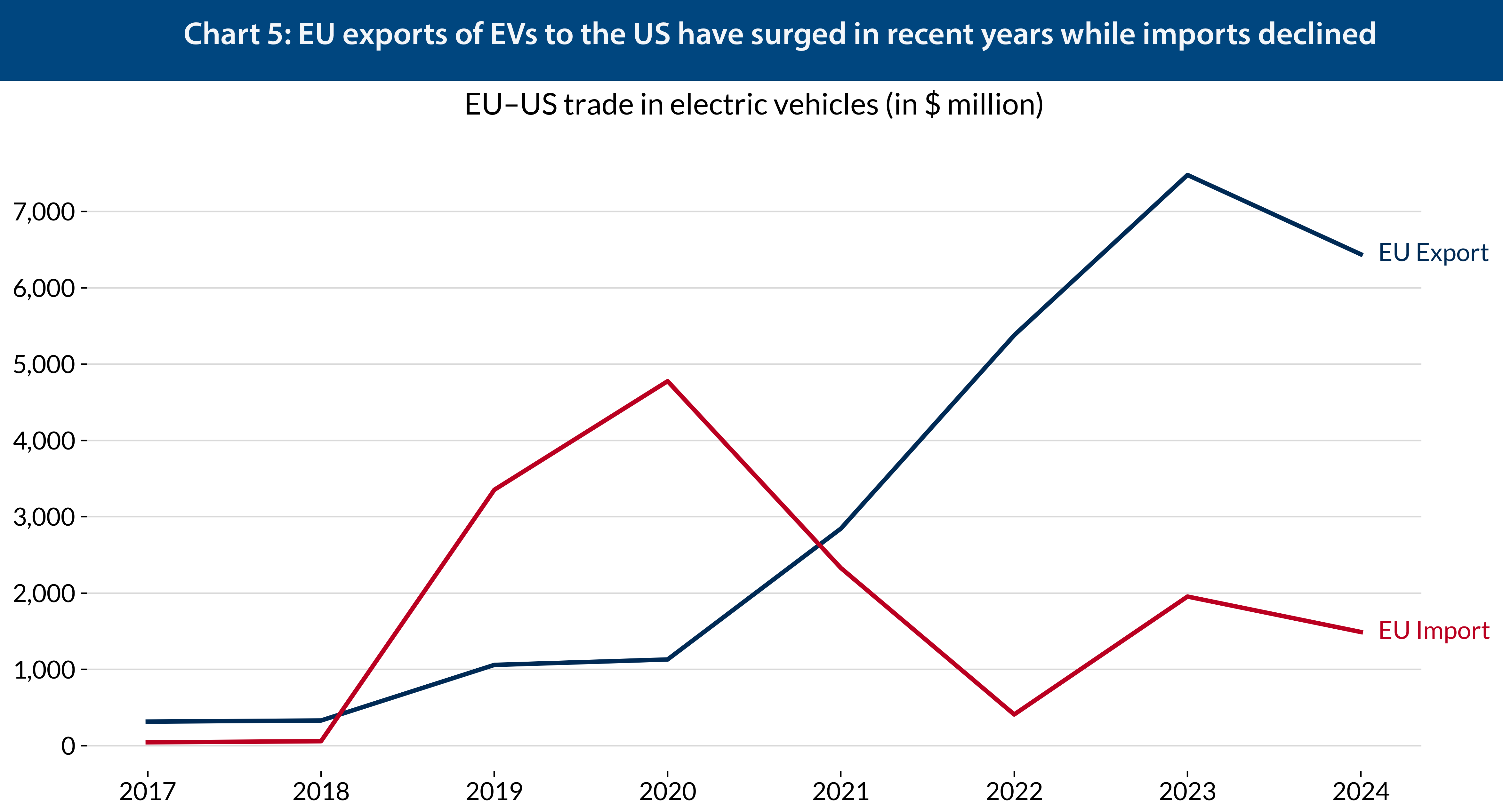 For some EU exports, such as EVs, reduced US demand is probably the dominant effect – and a key drag. US demand for clean tech was boosted substantially by the IRA. For example, the IRA offered an EV tax credit of up to $7,500, which was also available for EU-made EVs (although only for leased vehicles). Given that the US is a key export market for EU-made EVs (see Chart 5), the IRA would have provided crucial demand for EU car makers over the coming years. However, the OBBB has phased out EV tax credits, which will, it is estimated, result in 27-41 million fewer EV sales in 2035, a 20-30 per cent reduction from the current policy scenario.11 On top of that, Trump 2.0 has also used executive orders to reverse some of the supportive EV regulation of the Biden administration, like the vehicle emissions standards, as well as state-level policy initiatives, such as EV mandates in California.