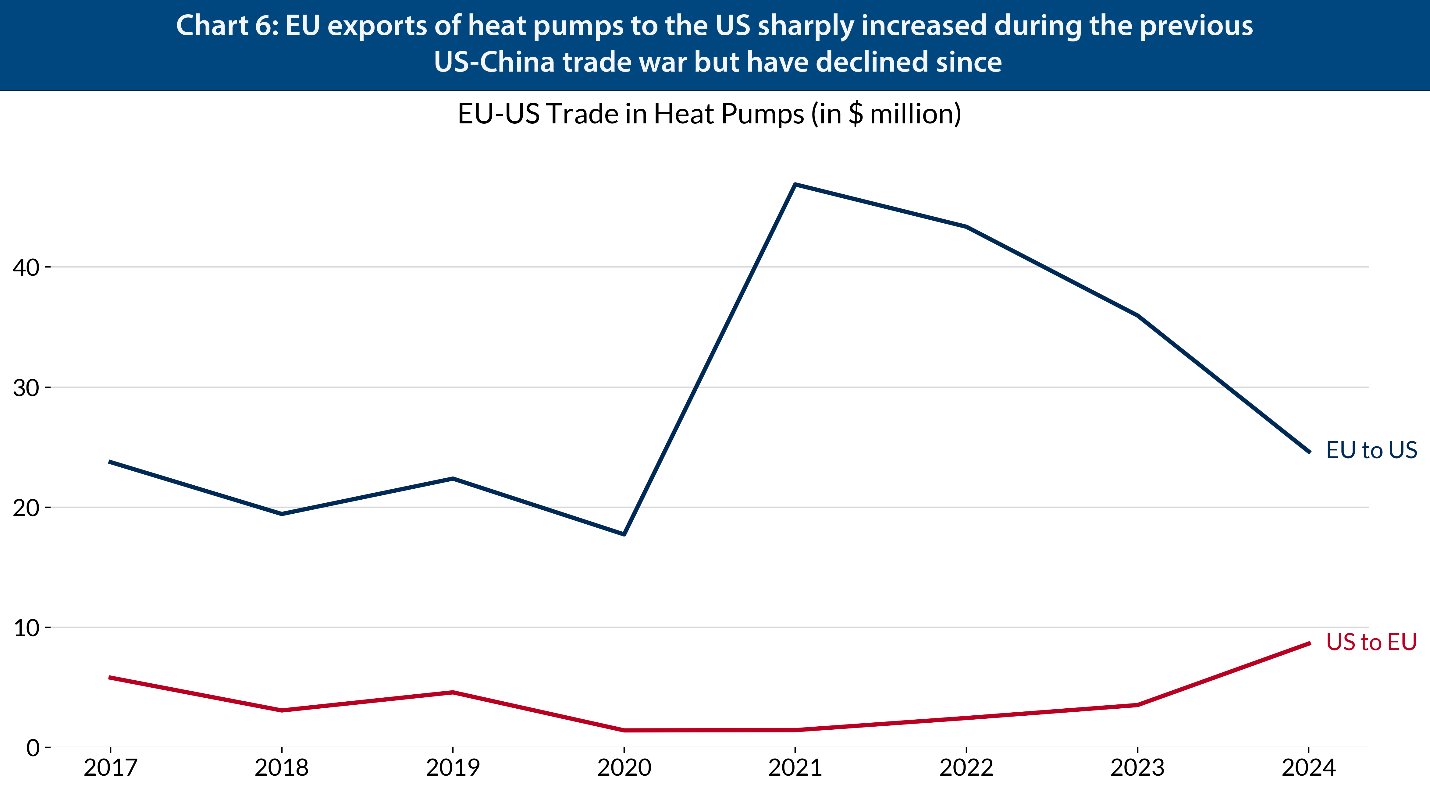 On the other hand, heat pump exports to the US are currently comparatively small, but could present a growing opportunity for EU producers in spite of the US phasing out heat pump subsidies. Because about 40 per cent of the US imports of heat pumps in 2024 came from China, tariffs on these goods would create tangible room for European manufacturers – provided they can match US price points and expand production. Chart 6 shows that European exports of heat pumps to the US rose sharply during the pandemic, after the previous US–China tariff rounds in the first Trump administration. This suggests that European suppliers could increase their export capacity again, especially if Chinese competitors retreated.