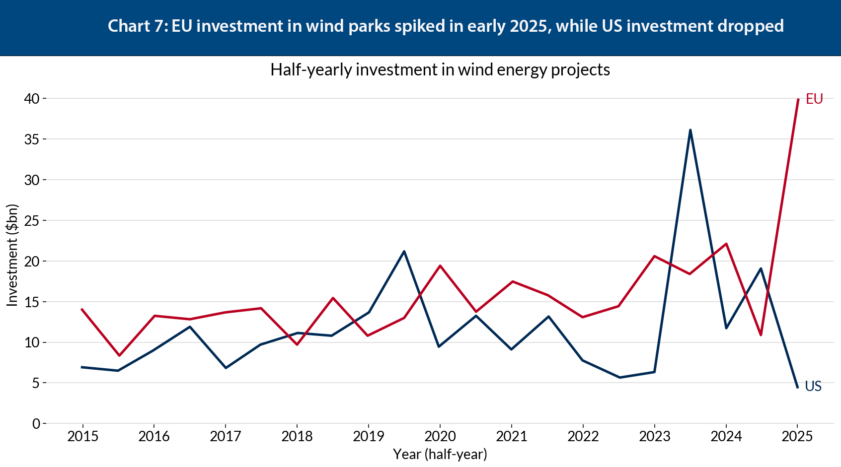On the other hand, EU exports of wind energy components to the US are likely to decrease in the short term. Wind energy is one of the few strongholds of EU clean tech industry, and EU-based manufacturers benefitted from and supplied products to power the IRA-driven surge of wind park projects in the US. However, the impact on wind energy of Trump’s policy reversal is already evident in the decline in demand for wind energy components. One striking example was the Trump administration’s unilateral halt to the $1.5 billion ‘Revolution Wind’ offshore wind project, for which EU manufacturers supplied most of the high value kit.16 While a federal judge’s decision has since ordered work to resume,17 getting permits for new wind projects will undoubtedly be much more difficult under this administration. Consequently, the export opportunities created by the IRA for wind are mostly gone for now. A silver lining might be that the US retrenchment causes some international wind project developers to shift their investments from the US to the EU, as indicated by recent investment figures for wind parks in Chart 7.