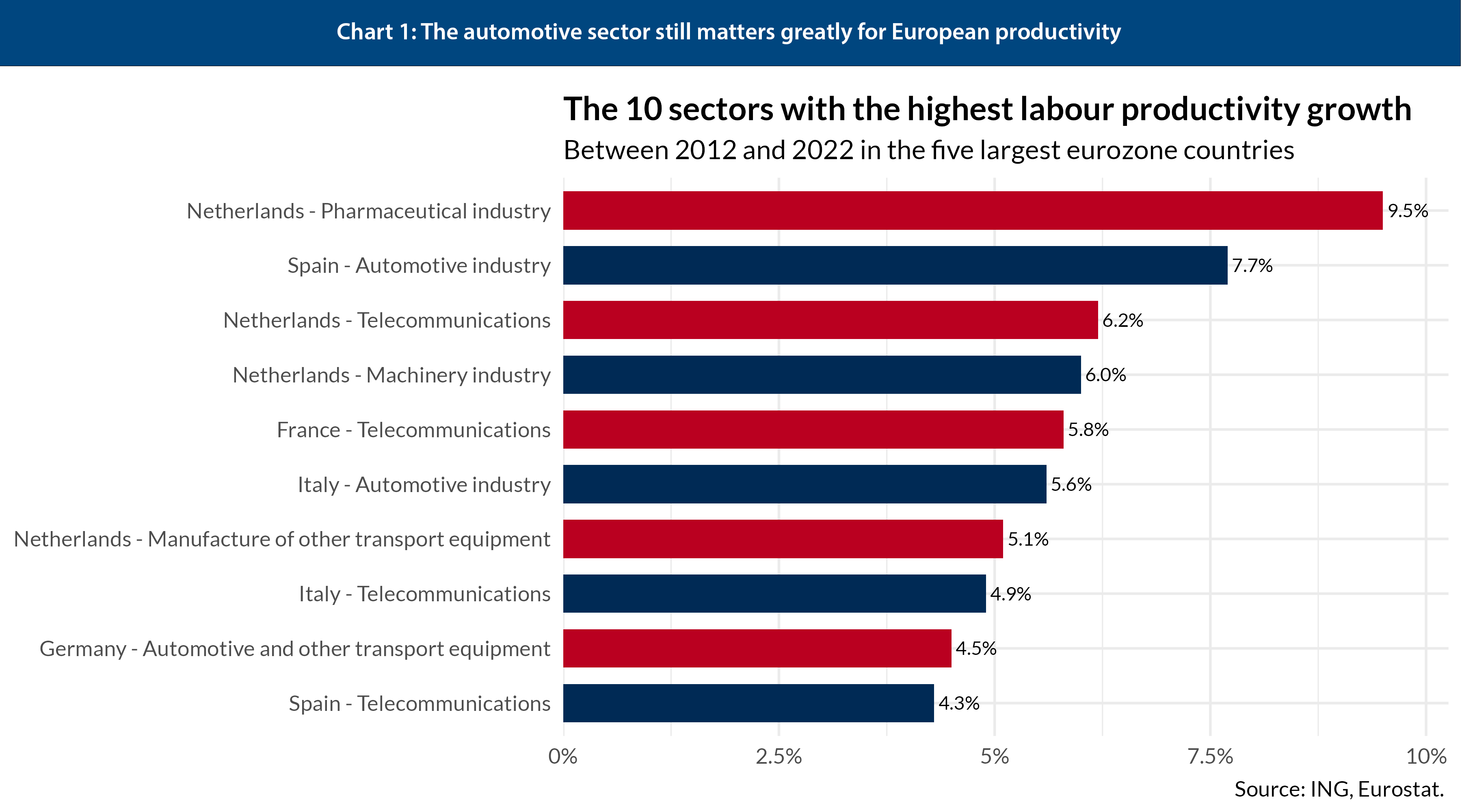 The fate of European car-making is not sealed, and policy support can help. There are encouraging signals that Europe’s automotive sector can compete in the 21st century, even if it will be smaller than in the past. Germany is already the world’s second-largest producer of EVs, ahead of the US, and more than a quarter of its car exports are now electric.7 The EU as a whole also runs a modest trade surplus in EVs, primarily thanks to exports to markets like the US, UK and Norway. Cars still matter greatly for productivity growth: four of the ten sectors with the strongest productivity growth in the five largest eurozone economies between 2012 and 2022 were in automotive and transport (see Chart 1). As long as Europe is still trying to catch up in information technology, manufacturing – with cars at the centre – will remain the locus of what little productivity growth the continent ekes out.