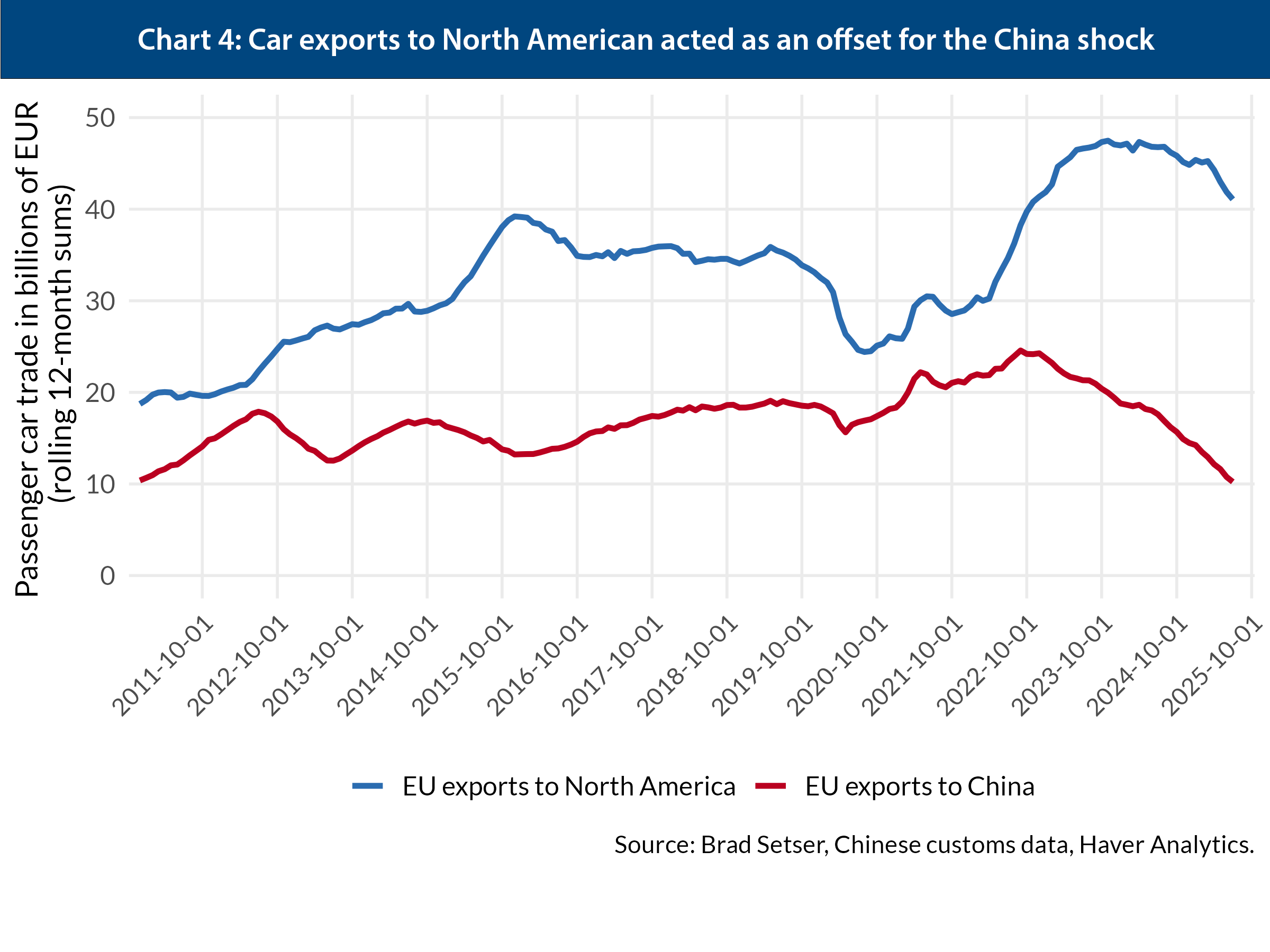 The EU’s tariffs on Chinese EVs, adopted in late 2024, comply with WTO rules but are insufficient to deal with the three-way demand shock. China’s car exports to Europe itself have recently slowed thanks to the EU’s duties and bottlenecks at ports and a lack of Chinese dealership networks in Europe.15 But BYD, China’s leading carmaker, is already expanding its fleet of car ships to break through shipping constraints, suggesting these obstacles are unlikely to alter the long-term trajectory.16