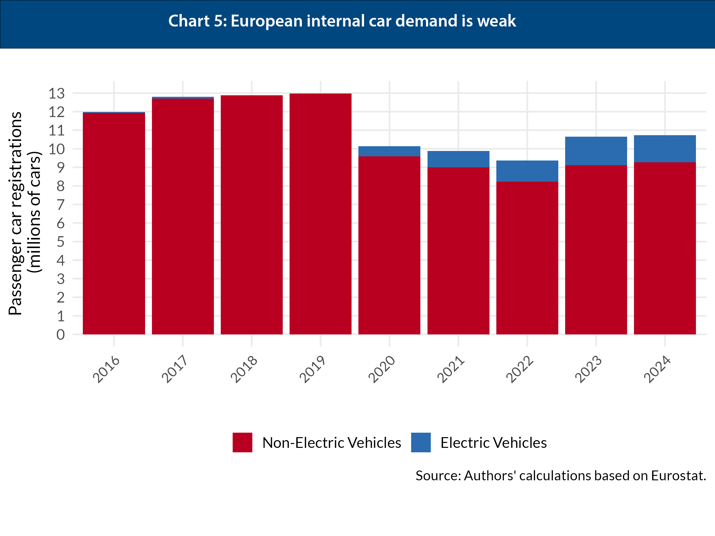 While EU producers are being squeezed out of the Chinese and US export markets, domestic demand has offered little relief. New car registrations in the EU collapsed during the pandemic and never fully recovered. In 2024, they were still about 20 per cent below pre-crisis levels, with an even steeper decline in key markets such as France and Germany (Chart 5).
