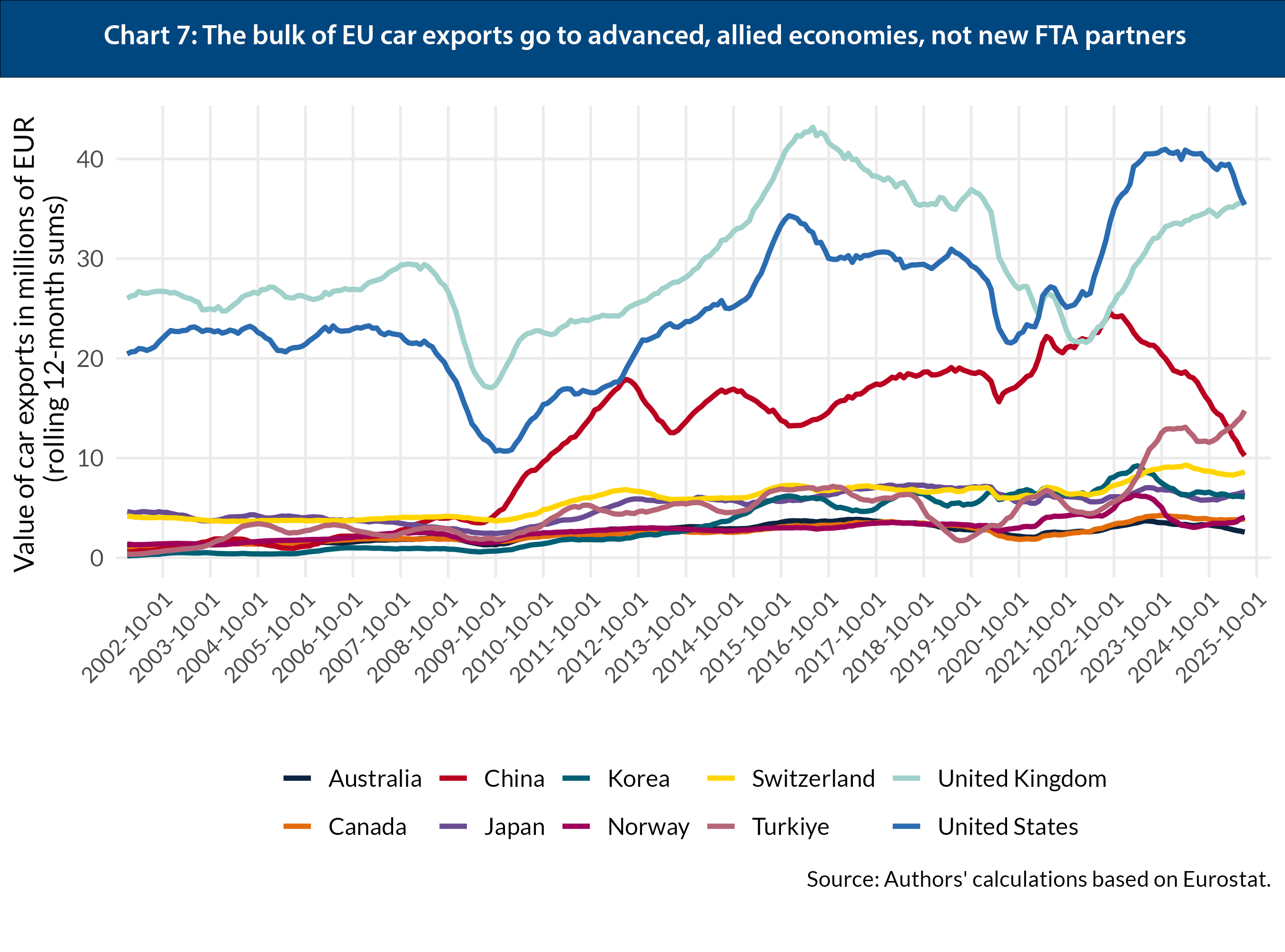 A Europeanised eco-bonus could also serve as a basis for closer co-operation with the UK. This summer, Britain – Europe’s second-largest car export market – introduced an EV subsidy scheme based on climate criteria that, much like the French model, is open to cars assembled in Europe but filters out Chinese production.45 Closer alignment between the UK and EU on EV subsidy design would ease compliance for European producers, shield both markets from Chinese overcapacity and build on the renewed UK-EU partnership – without crossing London’s red line on rejoining the single market. Over time, such arrangements could also be extended to Norway and Switzerland, whose EV schemes remain import-neutral, or to Turkey, which has already introduced tariffs on Chinese EV imports.