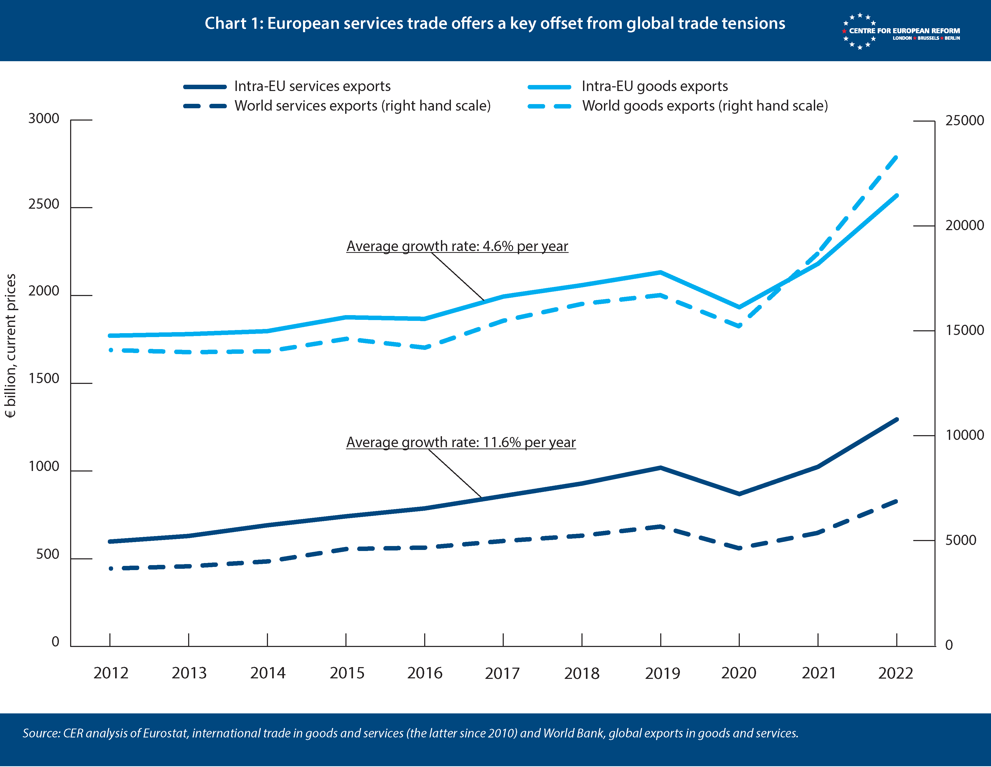- Services and city-led growth: The next phase of the single market must focus on services. Intra-EU services trade is growing fast, but it is concentrated in a few large cities. Without reform, integration will widen regional divides. The EU should: