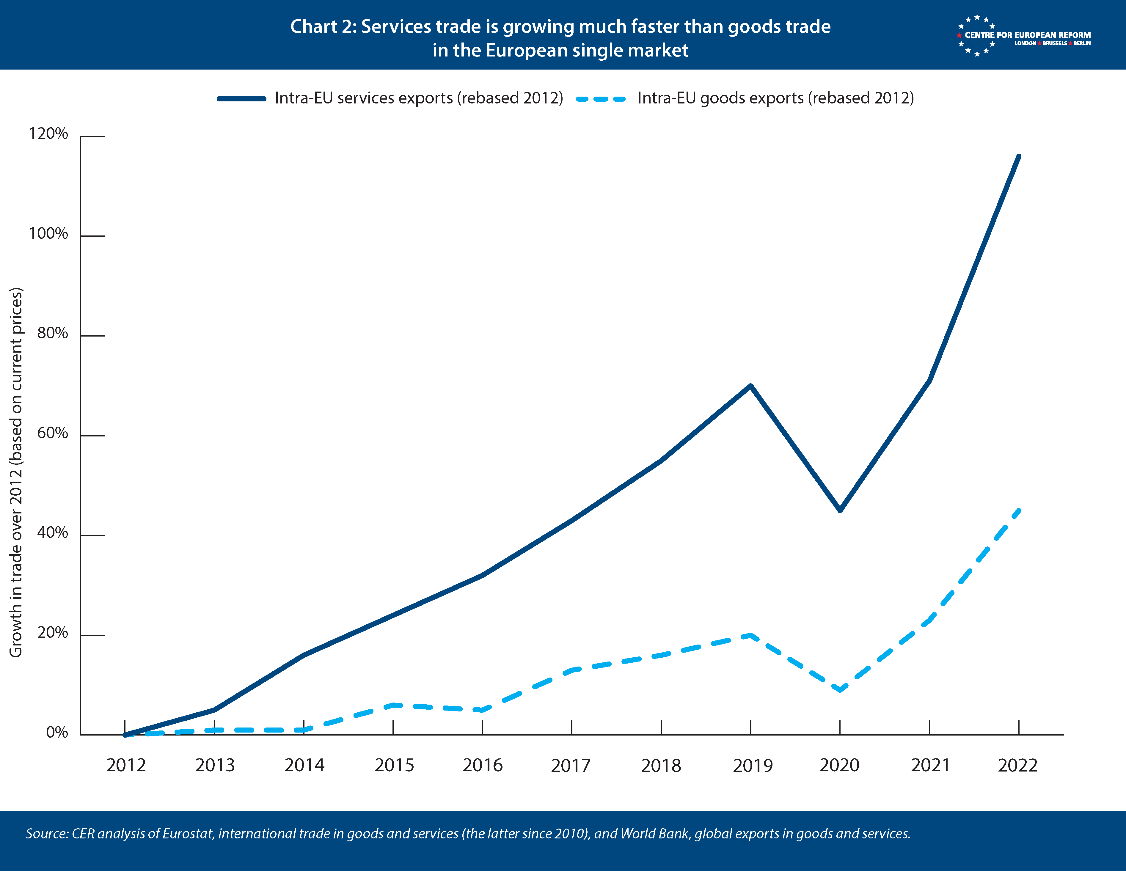 While the single market for goods drove income convergence between older member-states and those that joined after 2004, the engine of internal trade is shifting. Services now account for around 70 per cent of value added in the EU. Intra-EU services exports have grown faster than goods and far faster than global services trade. In 2012, intra-EU services exports were worth one-third the value of intra-EU goods exports; by 2022, that figure had risen to one-half. And services trade within the EU, despite doubling from 3 to 6 per cent of GDP between 1993 and 2021, still has ample room to grow. ‘Tradeability’ is almost by definition a measure of productivity: if it is possible to locate an office in one region and use it as a base to service hundreds of thousands of customers in other regions, productivity is likely to be high in terms of output per input. And higher productivity means higher income.