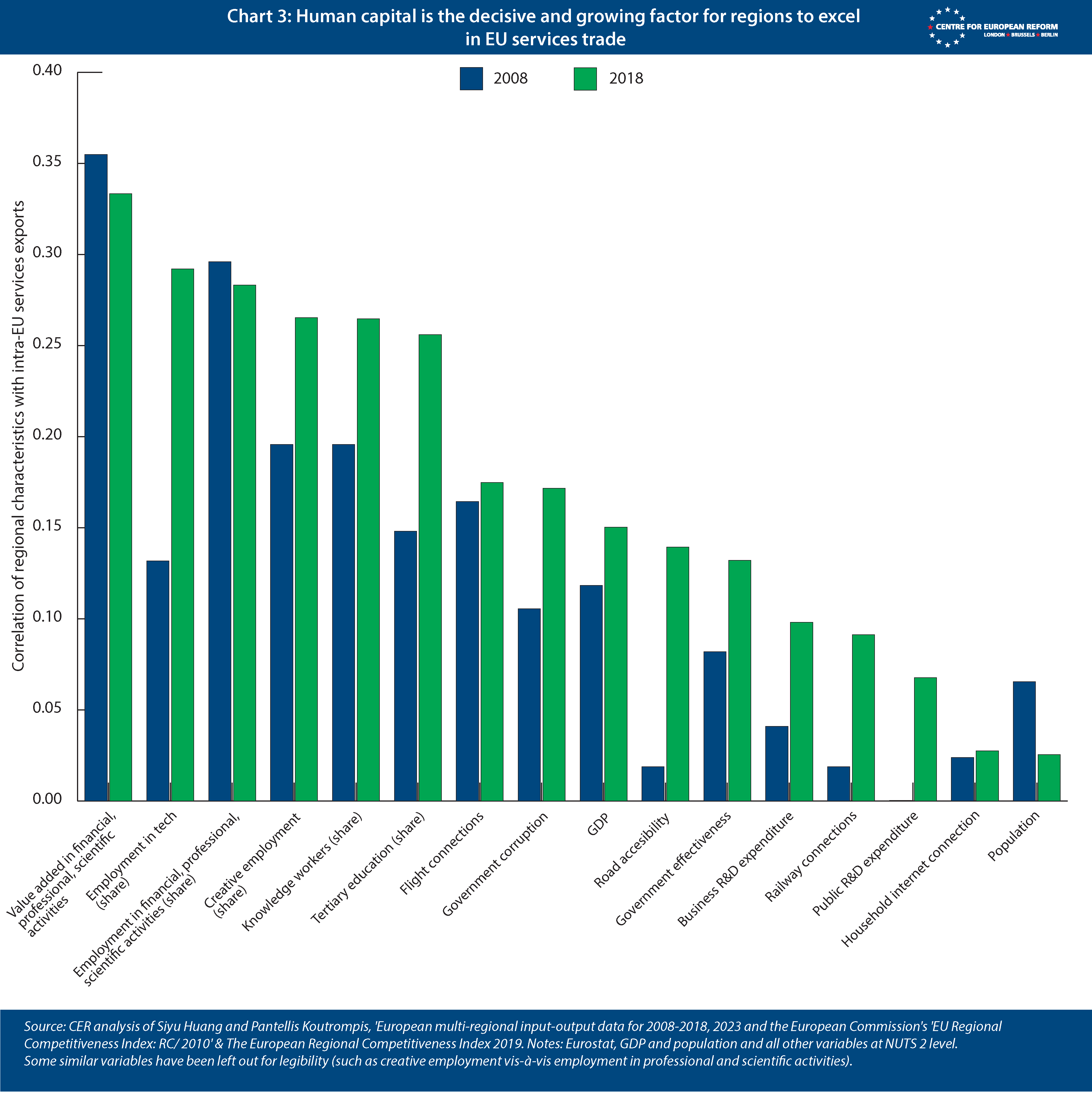 This pattern is becoming more entrenched. Between 2008 and 2018, the link between services exports and factors like GDP, population, and human capital strengthened (see Chart 3). The opposite happened in goods trade, where investment flowed to less populous, lower-cost regions in Central and Eastern Europe. Without targeted intervention, disparities between dynamic cities and their surrounding regions will widen.